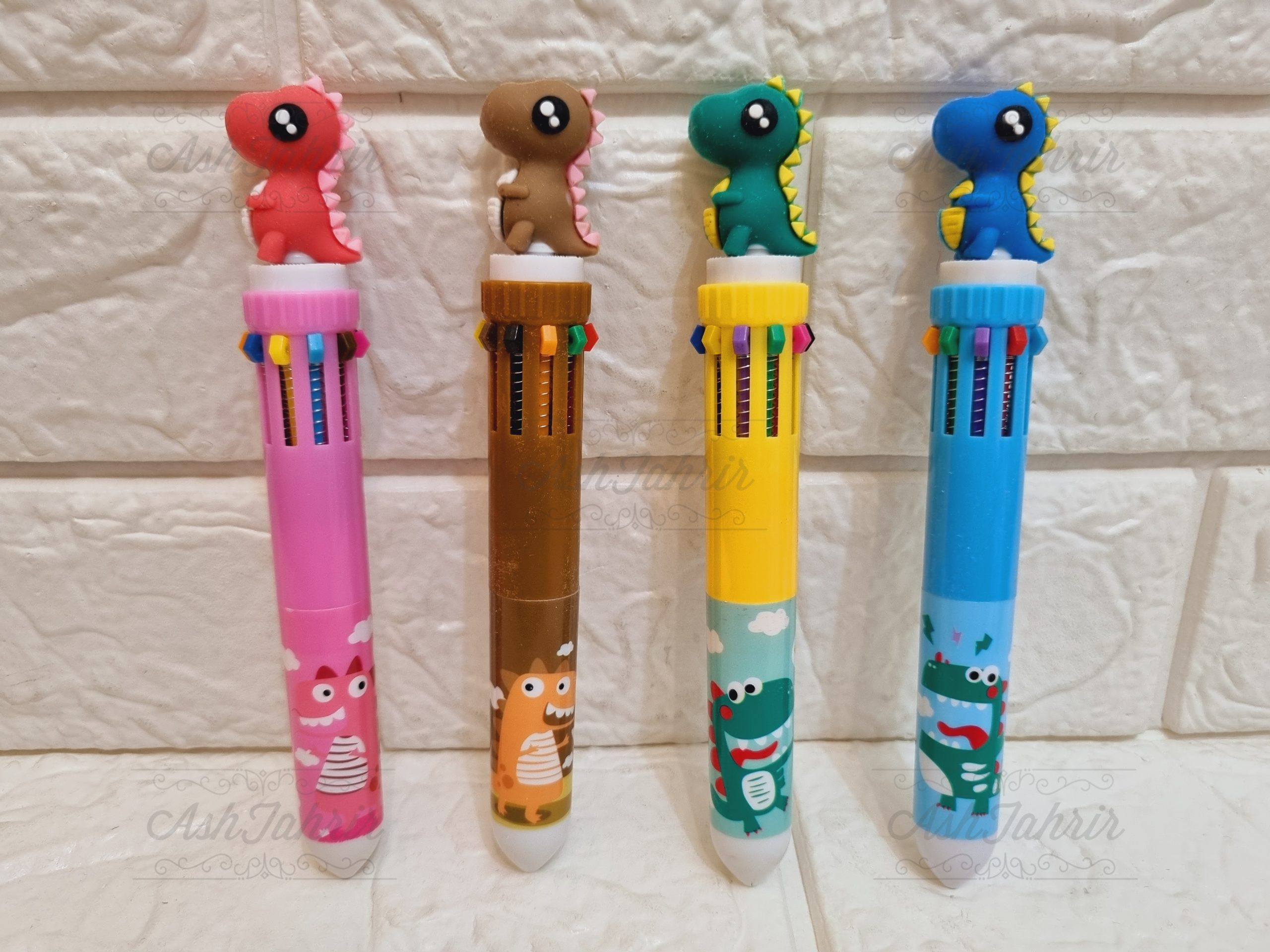 این خودکار طرح دايناسوري دارای 10 رنگ خودکار می باشد که به غیر از زیبایی خاص خود بسیار روان نیز می باشد . شما می توانید با فشار دادن هر رنگ از آن رنگ استفاده کنید و به راحتی نیز رنگ مورد نظر خود را با فشار دادن سر دايناسور به پايين، عوض کنید. این خودکار دارای عروسک با طرح دايناسوري از جنس سیلیکون می باشد که بر روی خودکار نصب می باشد. این خودکار جذاب دارای چهار رنگ آبي ، قهوه اي، زرد و صورتي است که هم برای پسرها و هم برای دخترها مناسب مي باشد.