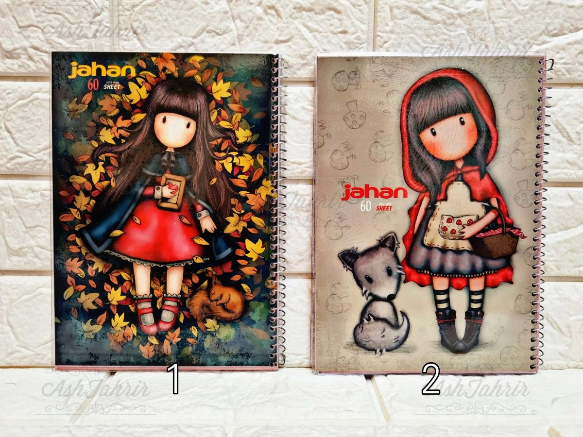 دفتر 60 برگ سیمی جلد پرسی دخترانه جهان در هفت طرح مختلف کارتونی مناسب کودکان و دانش آموزان می باشد. این دفتر مشق دارای خطوط آبی بوده و صفحات دارای حاشیه می باشند. جلد انعطاف پذیر دفتر جهان باعث می شود تا در کیف مدرسه آسیبی به دفتر وارد نشود و حمل آن به دلیل سبکی آسان باشد.